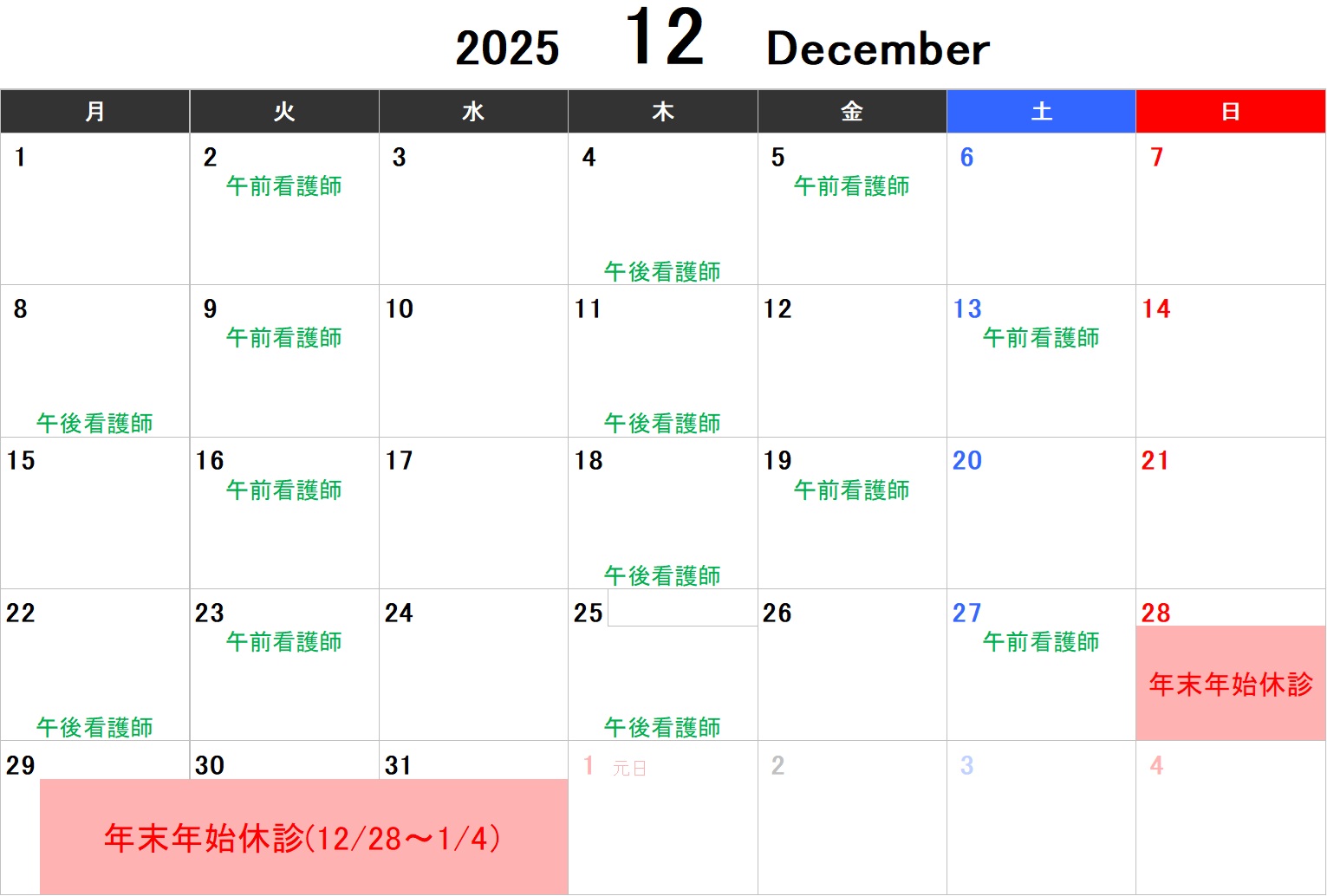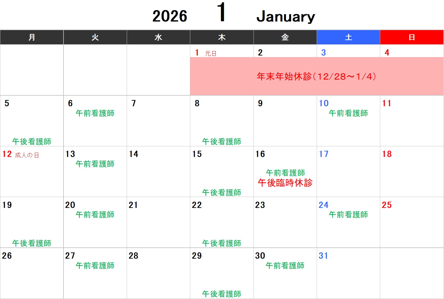 下記 診療日カレンダーをご確認ください。