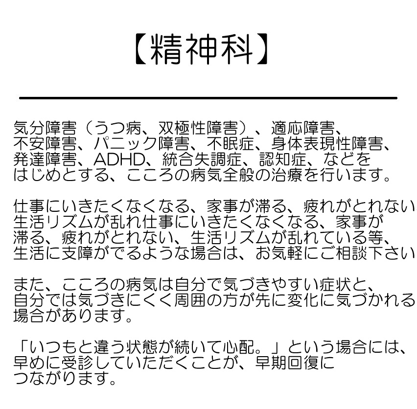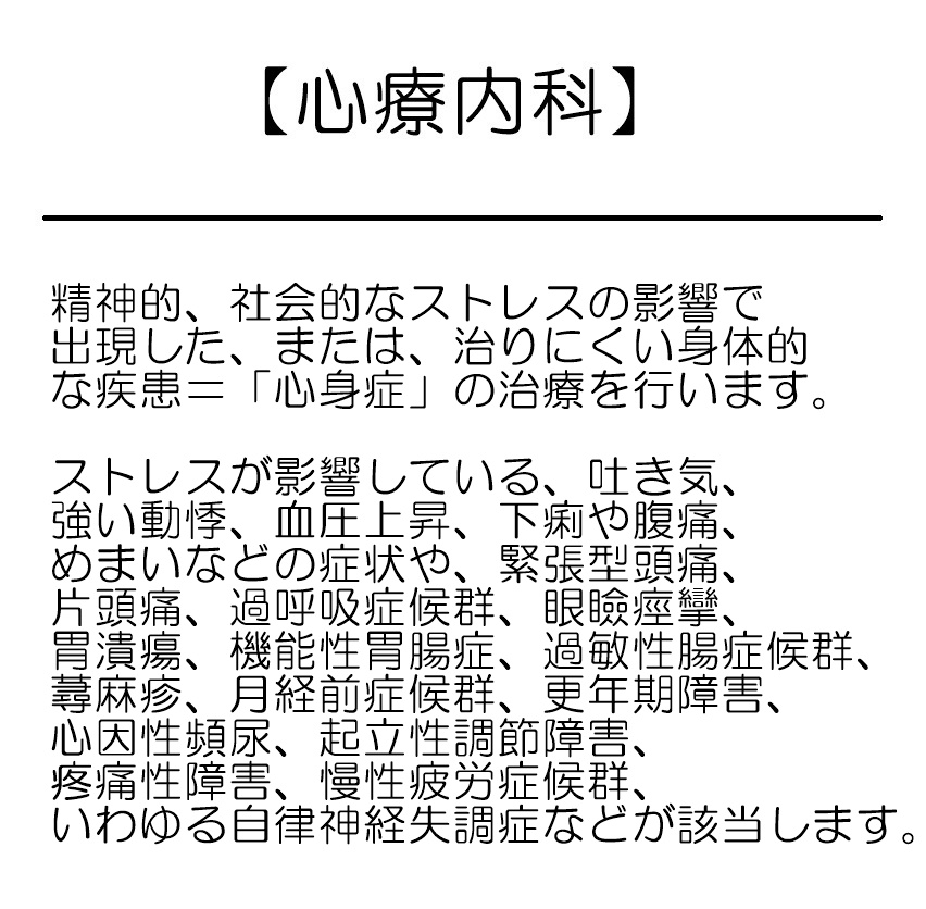 当院では、心療内科および精神科の疾患の全般的な治療を行っております。