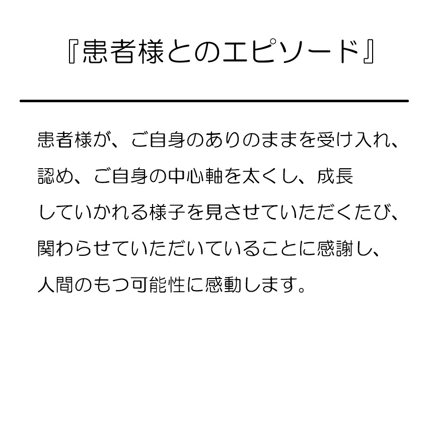 患者さん一人一人に合ったより良い医療を提供するためには、また、患者さんが健やかさを取り戻し、自分らしくイキイキ生きるためのお手伝いをするにはどうしたらいいのか?それを自問自答していく中で、クリニックだからこそできる、細やかなアプローチがあるのではないかという思いに至りました。心療内科、精神科、統合医療での活動などの経験を活かし、傾聴と対話を大切にし、ストレスケアや心身両面からのアプローチを取り入れた、全人的な心の医療を実践するため、開業を決意いたしました。
